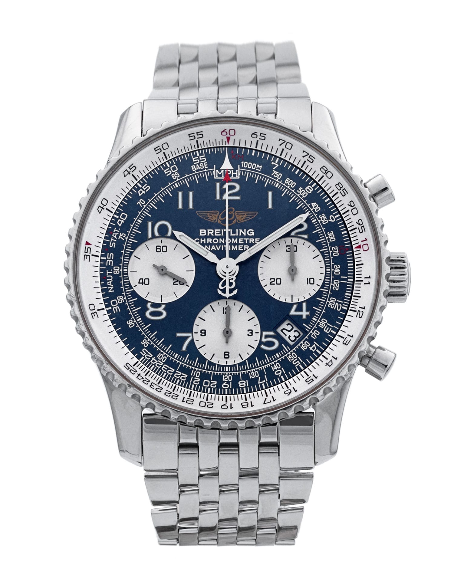 This Breitling Navitimer A23322 has a blue arabic dial and a bracelet strap. This Breitling has undergone a thorough inspection of water resistance, accuracy, functionality and condition to determine the level of reconditioning required to meet our strict standards. It has also been referenced against technical documents and manufacturer records where available to ensure authenticity and a clean history. All our watches have a 24-month warranty for your peace of mind.